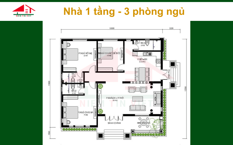 Mẫu nhà 1 tầng 3 phòng ngủ