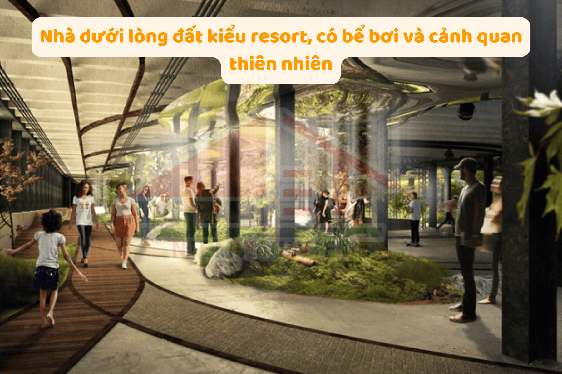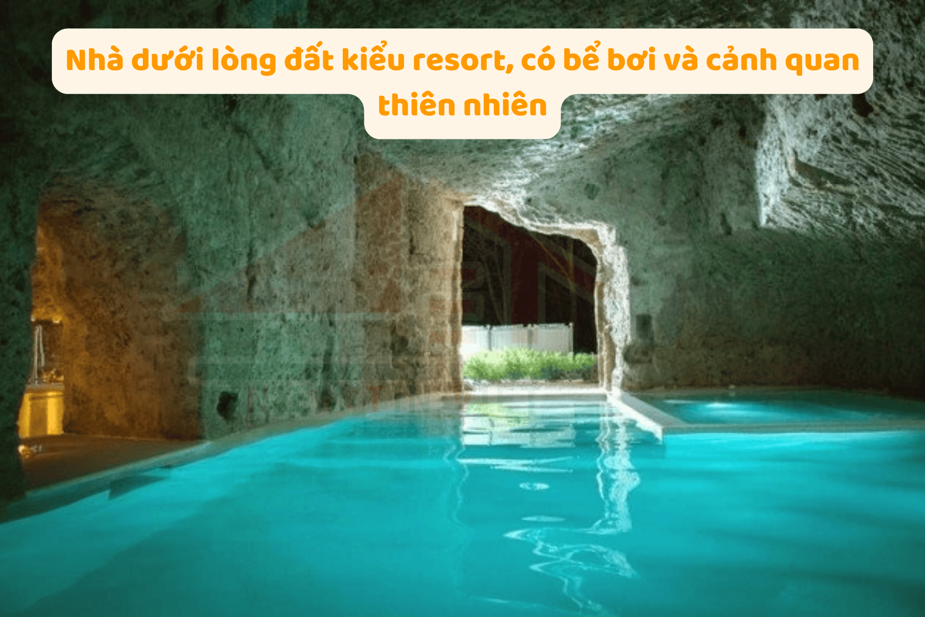 Nhà dưới lòng đất kiểu resort, có bể bơi và cảnh quan thiên nhiên