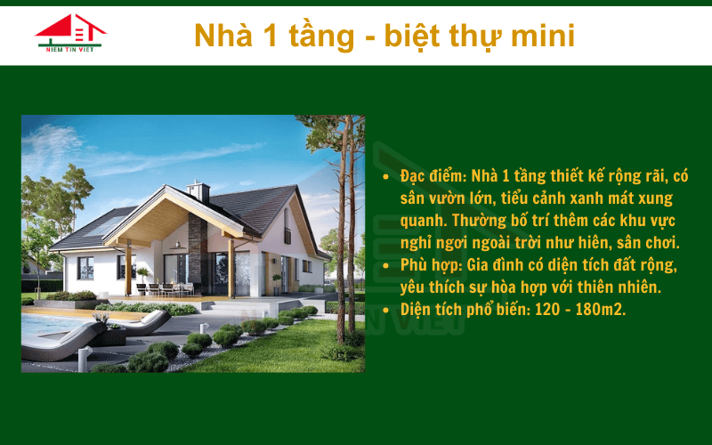 • Đặc điểm: Thiết kế 3 phòng ngủ, 1 phòng khách liền bếp, mái thái đổ bê tông dán ngói. Bao quanh là vườn tiểu cảnh nhỏ, phù hợp gia đình có người lớn tuổi cần không gian yên tĩnh.